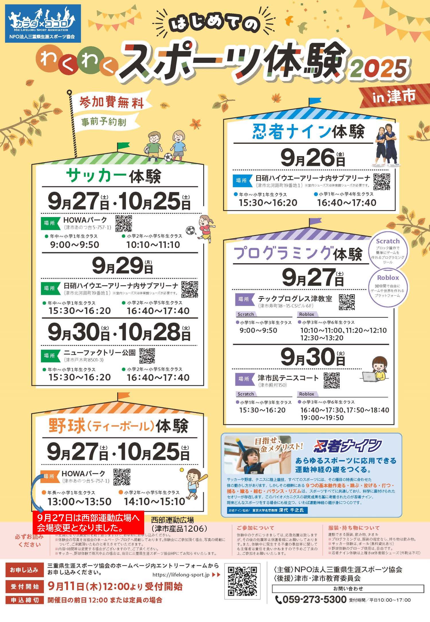 サッカーや野球、忍者ナインなど、参加無料です。