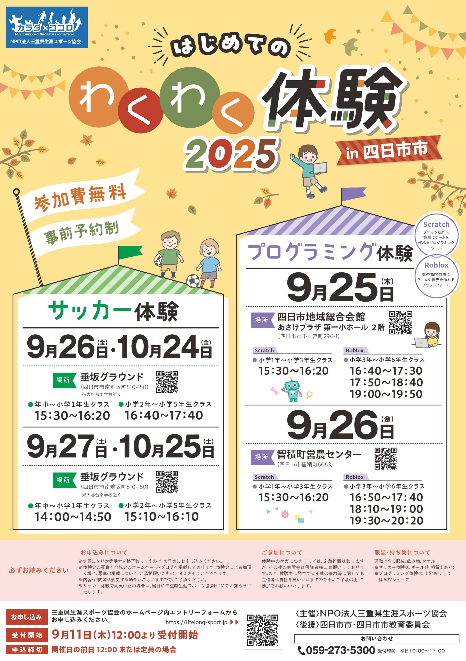 四日市市の子どもたちの体験機会の創出を目指して、サッカー体験とプログラミング体験を開催します。