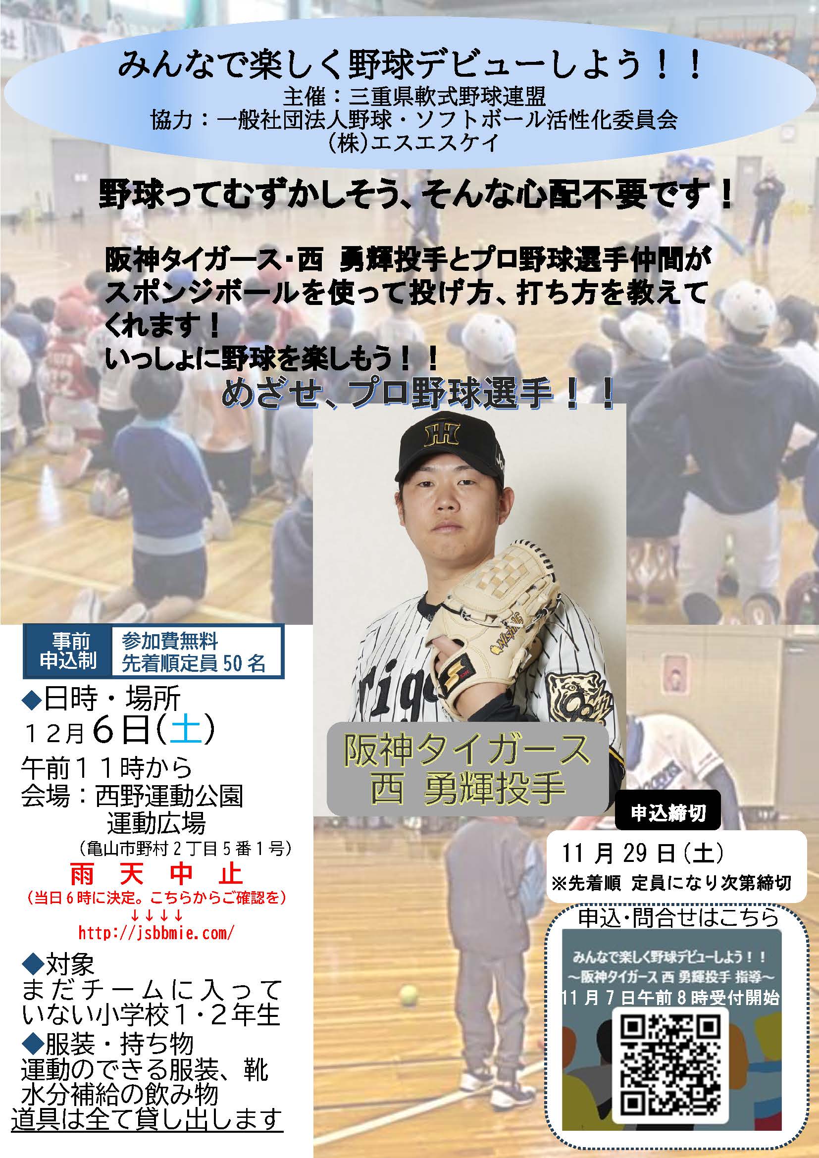 12月6日(土)、亀山市の西野運動公園運動広場にて「みんなで楽しく野球デビューしよう!」のイベントを三重県軟式野球連盟が開催されます。