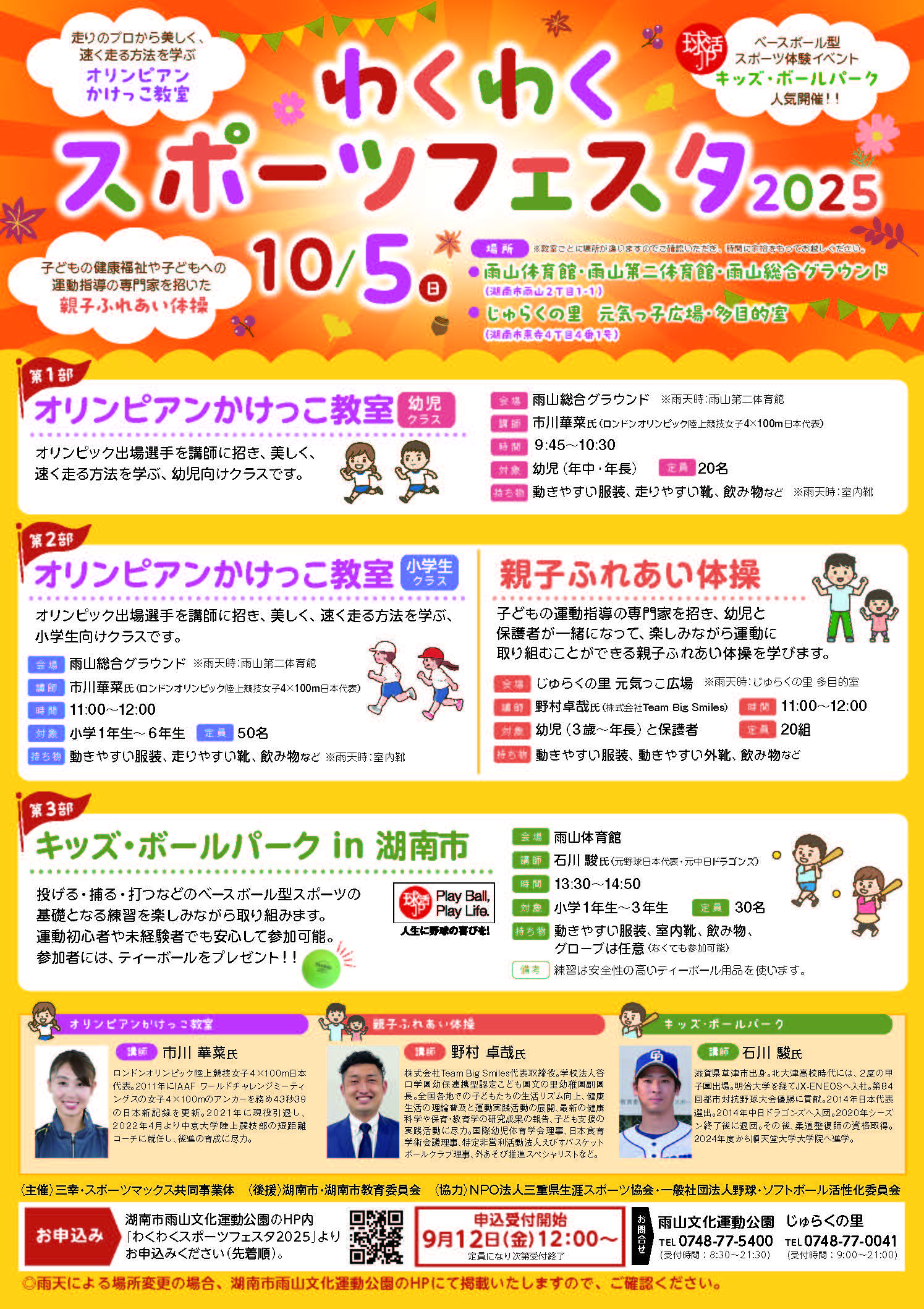 ロンドンオリンピック陸上日本代表の市川華菜さんを講師に迎えたかけっこ教室や元中日ドラゴンズの石川駿さんを招いた「キッズ・ボールパーク」、子どもの運動指導のスペシャリストである株式会社TeamBigSmilesの野村卓哉さんによる「親子ふれあい体操」を行います。