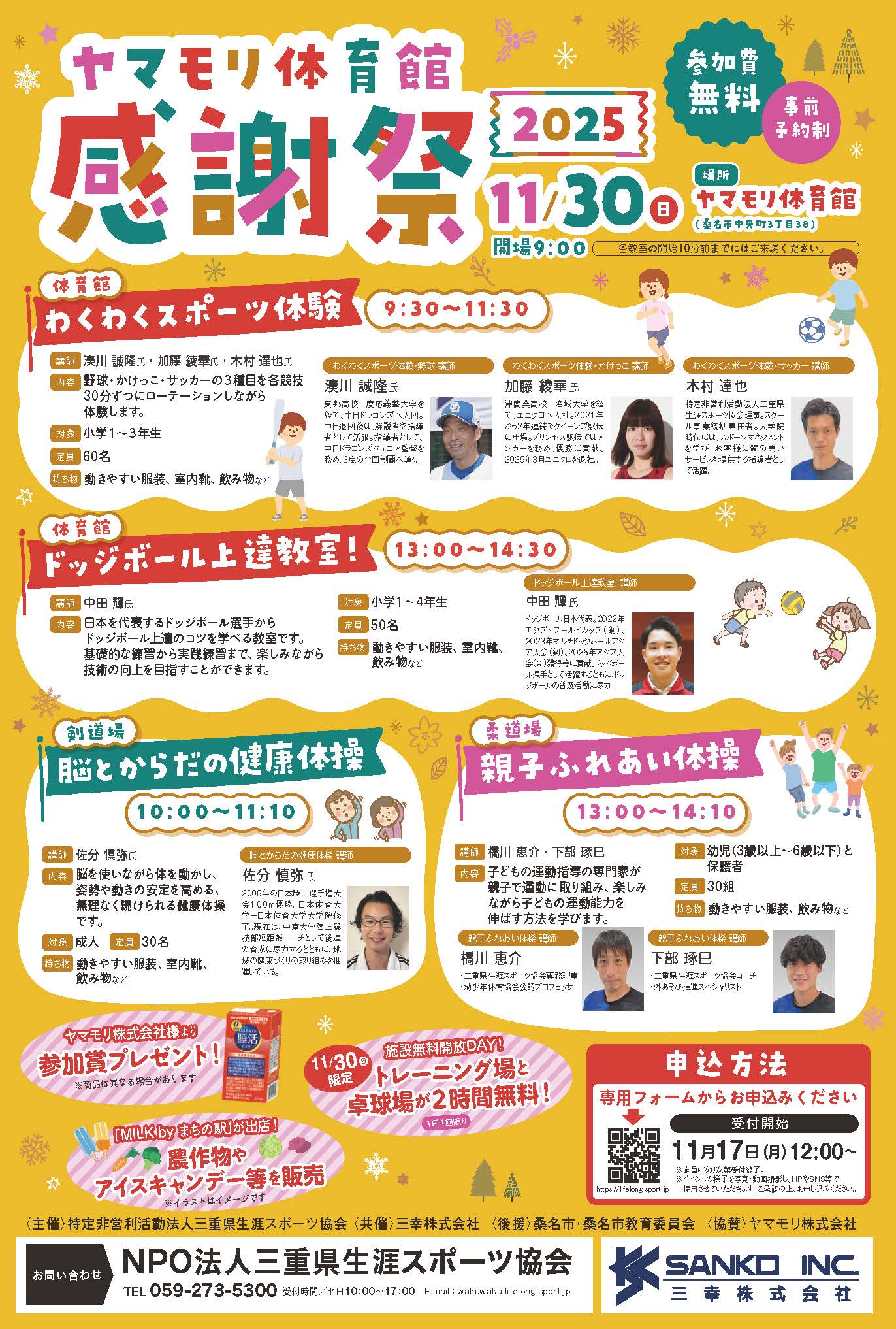 11月30日(日)、桑名市のヤマモリ体育館にて「ヤマモリ体育館感謝祭2025」を開催いたします。