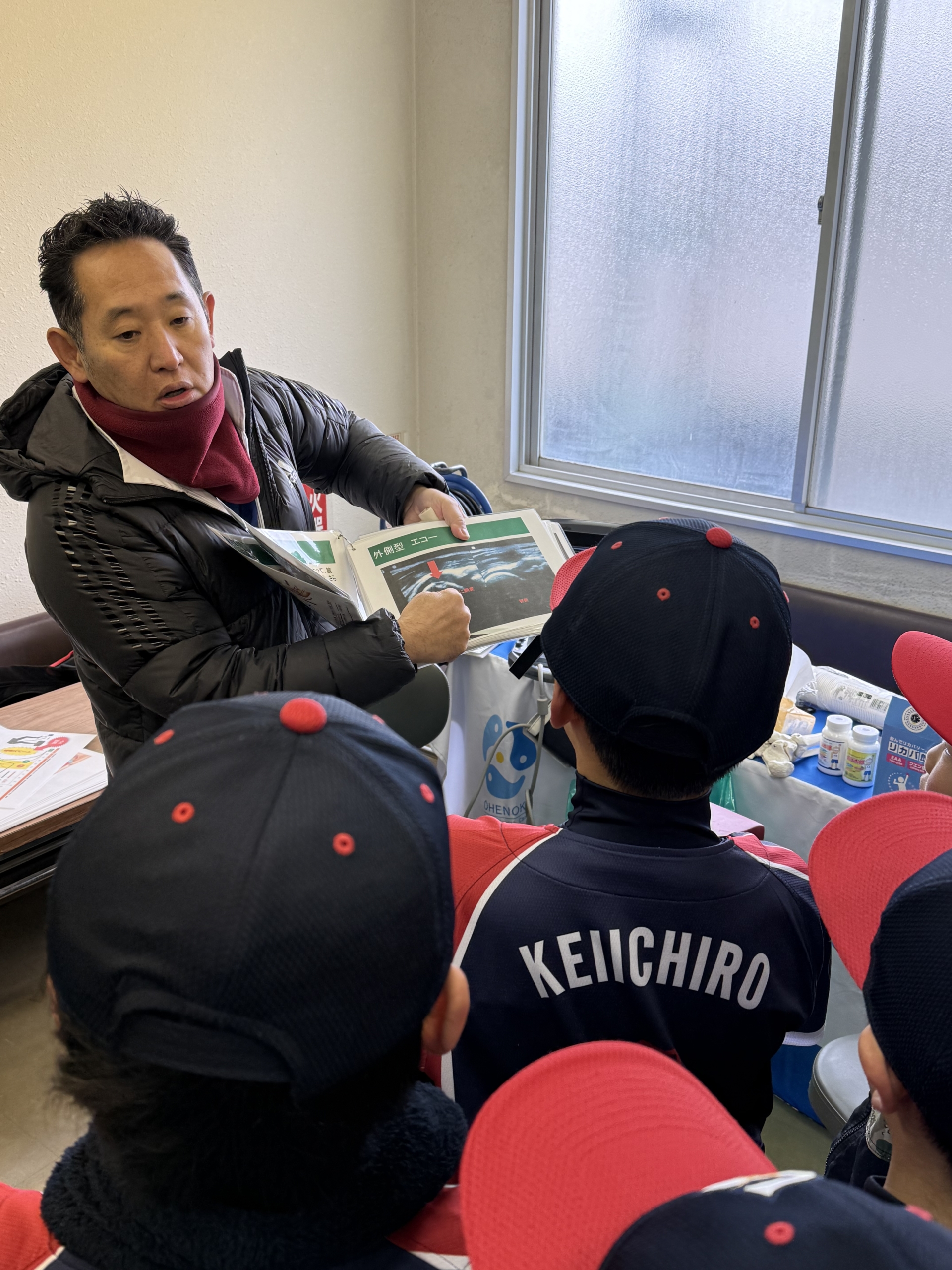 また、大会中は、おおえのき接骨院の大榎良則院長による、メディカルチェックが開催されており、エコーによる野球肘や骨端線のチェック、バランス能力チェック等を行っていただきました。選手や保護者にとっても身体づくりへの意識が高まる機会となりました。